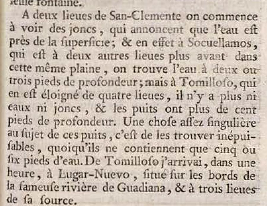 "A dos leguas de San Clemente se comienzan a ver juncos, que anuncian que el agua esta cerca de la superficie; y en efecto en Socuéllamos, que está a dos leguas más adelante en la misma llanura, se encuentra el agua a dos o tres pies de profundidad; pero en Tomelloso, que está a cuatro leguas, no hay ni agua ni juncos, y los pozos tienen mas de cien pies de profundidad. Una cosa bastante singular de estos pozos, es que son inagotables, aunque solo contengan cinco o seis pies de agua. De Tomelloso se llega, en una hora a Lugar Nuevo (Argamasilla de Alba), situado en las orillas de la famosa ribera del Guadiana, y a tres leguas de su nacimiento."