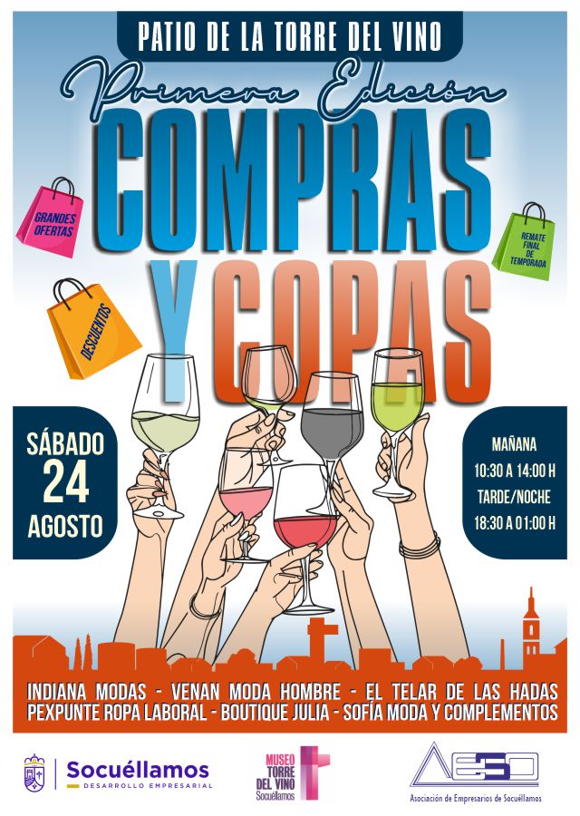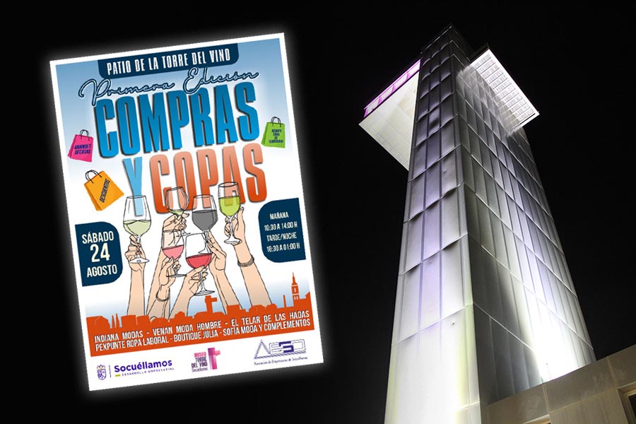 Este sábado 24 de agosto la Asociación de Empresarios de Socuéllamos (Aeso) organiza, en colaboración con el Ayuntamiento de Socuéllamos, la primera edición de una nueva campaña del comercio local, “COMPRAS Y COPAS”, que se celebrará en el patio de la Torre del vino.