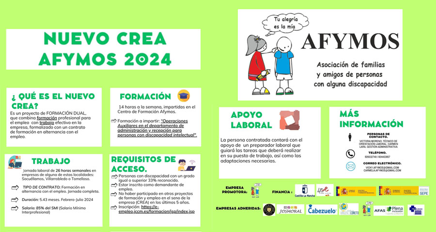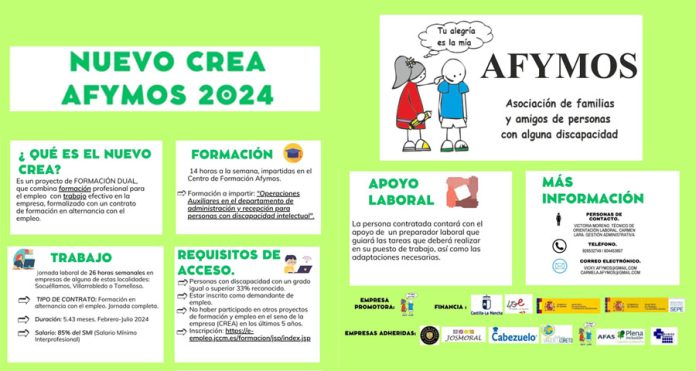 Afymos promueve un proyecto de Formación y Empleo en el seno de la empresa NUEVO CREA, que pretende ser útil para impulsar el empleo entre personas con discapacidad. La modalidad de formación será dual, es decir, que combinará formación profesional con trabajo efectivo en la empresa que será formalizado con un contrato de formación en alternancia con el empleo.