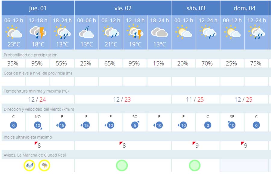 La Unidad de Protección Civil y Emergencias de la Subdelegación del Gobierno de España en Ciudad Real ha emitido un comunicado advirtiendo de episodios de fenómenos meteorológicos adversos para hoy día 1 de junio, tras conocer el informe de la Agencia Estatal de Meteorología (AEMET).