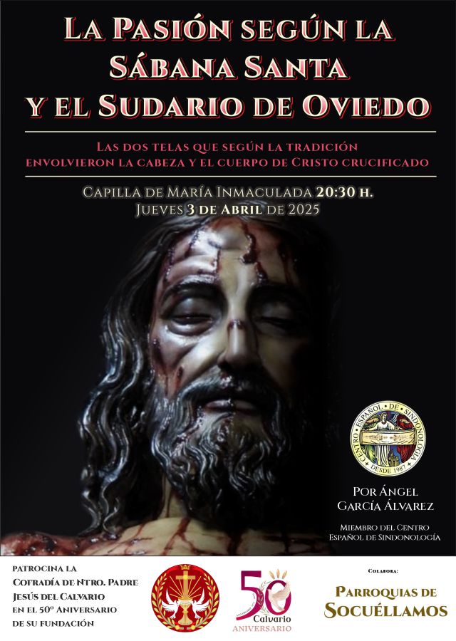 En el marco de los actos programados con motivo del 50º Aniversario de la Cofradía de Jesús del Calvario el próximo jueves 3 de abril en la Capilla de María Inmaculada a las 20:30 h. tendrá lugar la charla: 'La Pasión según la Sábana Santa y el Sudario de Oviedo' a cargo de Ángel García Álvarez, aunque arquitecto de profesión, se dedica también a dar charlas divulgativas como miembro del Centro Español de Sindonología, asociación dedicada a la investigación y divulgación de las reliquias relacionadas con Jesucristo que puedan ser objeto de estudio científico. Como curiosidad Ángel fue el arquitecto que hizo la ampliación del Centro de Salud Cándido Pozuelo.