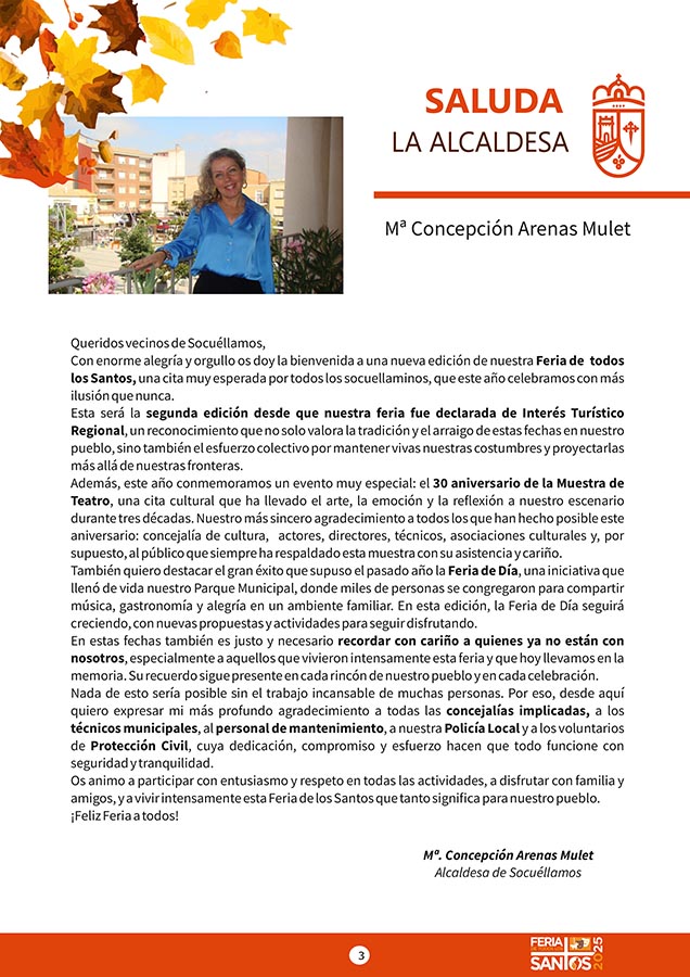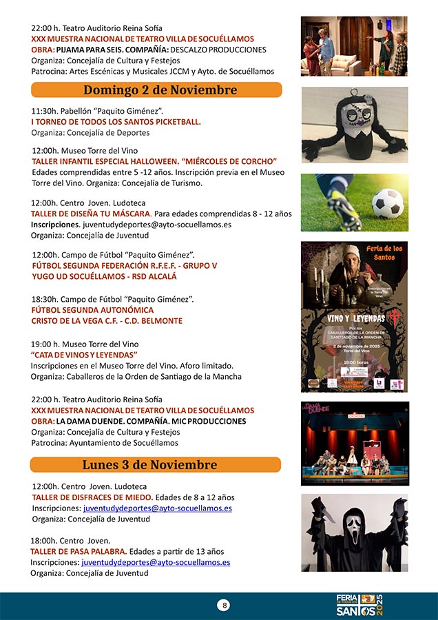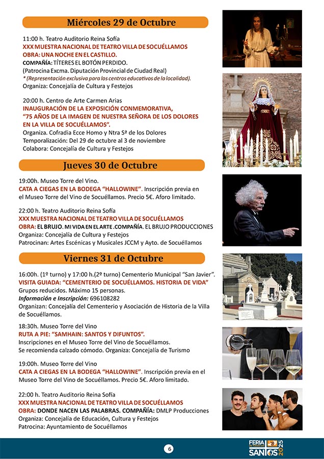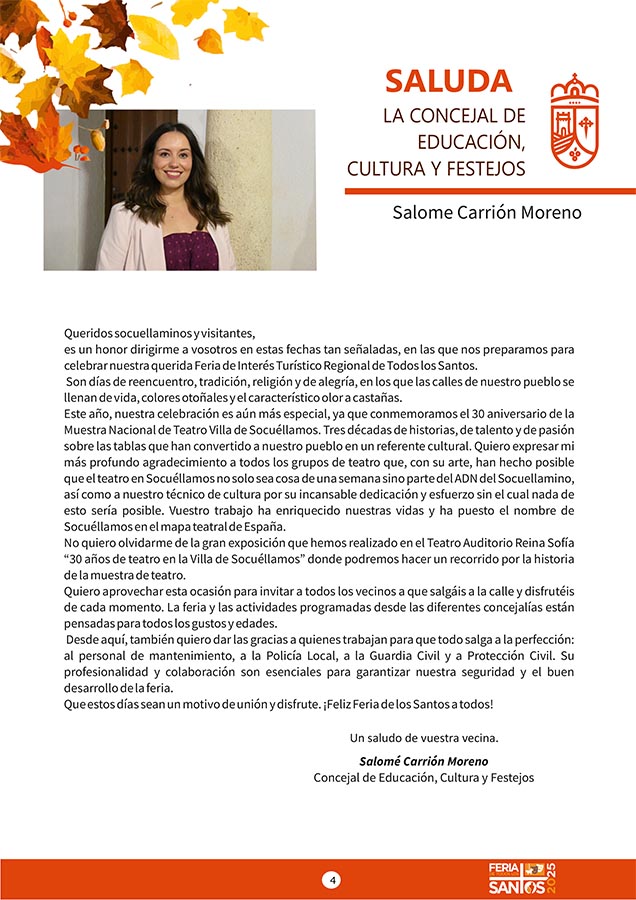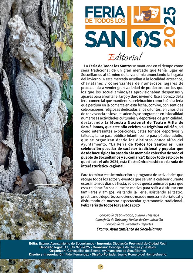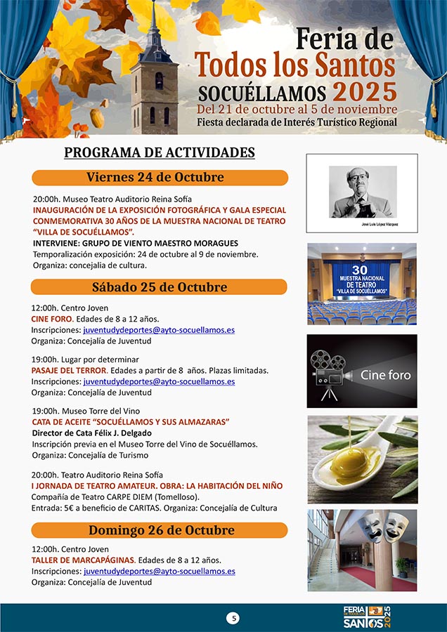 CULTURA Aquí puede consultar el Programa de Actividades de la Festividad de Los Santos 2025 octubre 21, 2025 FacebookTwitterWhatsAppEmailTelegram - Publicidad - - Publicidad - TagsFERIA DE LOS SANTOS 2025PROGRAMA DE LOS SANTOS MÁS NOTICIAS El Juvenil sigue líder, empate del Senior y derrota del Femenino en las categorías del Cristo de la Vega CF Santoral del 21 de octubre. Laura, Úrsula, Bertoldo, Cilina, Hilarión, Juan, Malco, Mauronto, Pedro, Severino, Vendelino y Viator. DO La Mancha cierra su vendimia 2025 con una reducción significativa de la producción. Tercera jornada del Torneo de Navidad 'III Memorial Jesús Delgado' El Kiele pierde en el tie break tras un épico partido CULTURA Aquí puede consultar el Programa de Actividades de la Festividad de Los Santos 2025 octubre 21, 2025 FacebookTwitterWhatsAppEmailTelegram - Publicidad - - Publicidad - TagsFERIA DE LOS SANTOS 2025PROGRAMA DE LOS SANTOS MÁS NOTICIAS La AECC de Socuéllamos presenta las actividades del Día Mundial contra el Cáncer de Mama 2025 Santoral del 21 de octubre. Laura, Úrsula, Bertoldo, Cilina, Hilarión, Juan, Malco, Mauronto, Pedro, Severino, Vendelino y Viator. NOTA DE PRENSA DEL PSOE SOBRE EL CONTRATO DEL AGUA “En un Lugar de La Mancha”, el humor de Agustín Durán llega este sábado a la Casa de la Encomienda El Auditorio 'Reina Sofía' acogerá la Gala Conmemorativa de la XXX Muestra Nacional de Teatro “Villa de Socuéllamos”
