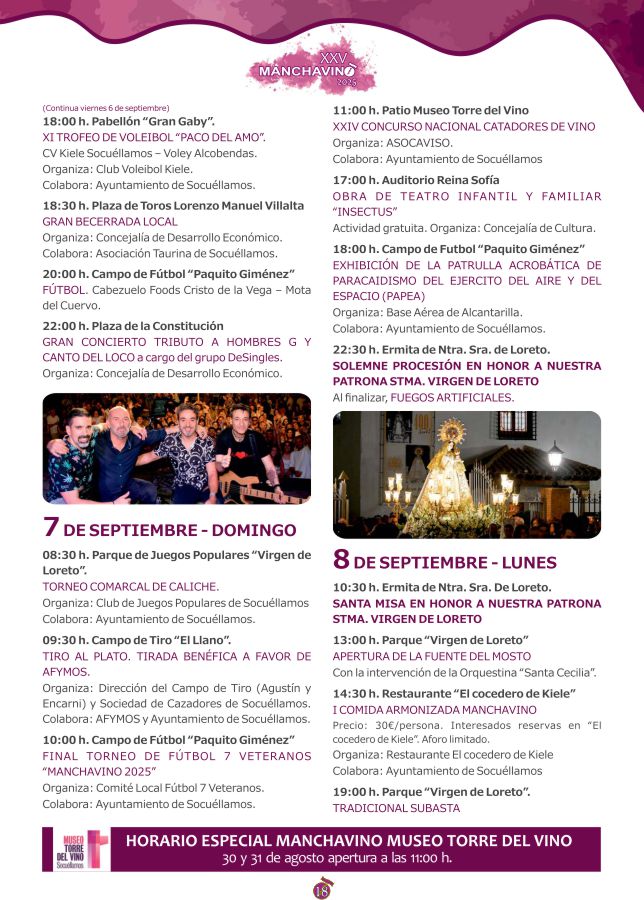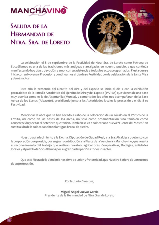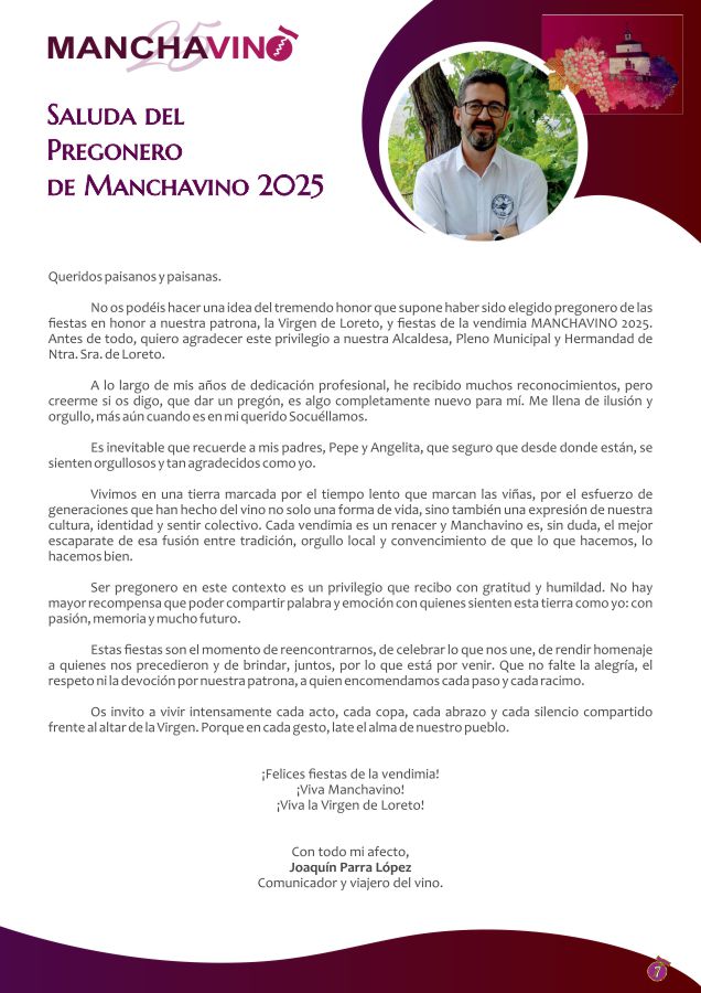 CULTURA Aquí puede consultar el Programa Oficial de Actos de MANCHAVINO 2025 agosto 27, 2025 FacebookTwitterWhatsAppEmailTelegram - Publicidad - Aquí puede consultar online el Programa Oficial de Actos de MANCHAVINO 2025 - Publicidad - TagsACTOSMANCHAVINO 2025PROGRAMA MANCHAVINOVirgen de Loreto MÁS NOTICIAS Unión de Uniones de Castilla-La Mancha denuncia en nota de prensa otro golpe a los jóvenes agricultores Miriam Peñalver abre una consulta que la que ofrecerá un enfoque más amable de la dietética El cura borracho que inventó la Argentina Santoral del 13 de noviembre. Diego, Abón, Bricio, Calixto, Dalmacio, Himerio, Homóbono, Leoniano, Luis, Maxelendis, Mitrio, Nicolás y Quinciano. El Grupo de Viento 'Maestro Moragues' conmemora Santa Cecilia con un homenaje a Frank Sinatra CULTURA Aquí puede consultar el Programa Oficial de Actos de MANCHAVINO 2025 agosto 27, 2025 FacebookTwitterWhatsAppEmailTelegram - Publicidad - Aquí puede consultar online el Programa Oficial de Actos de MANCHAVINO 2025 - Publicidad - TagsACTOSMANCHAVINO 2025PROGRAMA MANCHAVINOVirgen de Loreto MÁS NOTICIAS Isidro Arribas llena el salón de plenos en la presentación de su libro La Semana del Enoturismo culmina con la V Cata de Vinos en Rama en Bodegas Hermanos Delgado Santoral del 14 de noviembre. José, Adeltrudis, Alberico, Andrónico, Antigio, Dubricio, Esteban Teodoro, Hipacio, Jocundo, Juan, Lorenzo, Rufo, Serapión, Siardo, Teodoto, Trahamunda, Venerando y Vitón. Los rebaños de vacas y ovejas bajando por la Cañada Conquense dejan preciosas estampas a su paso por Titos El cura borracho que inventó la Argentina