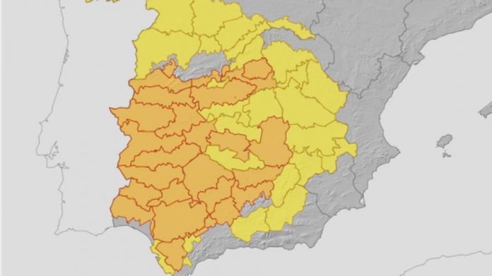 La Agencia Estatal de Meteorología (Aemet) avisa de que el termómetro subirá este lunes y la alerta naranja (riesgo importante) alcanza a toda Extremadura, donde los termómetros escalarán hasta los 42 grados en Badajoz y los 41 en Cáceres, al igual que en el valle del Guadalquivir. Marcarán 38 grados en puntos de la Meseta Sur; y 37 en el interior de Cataluña, valle del Ebro y en la Comunidad de Madrid.