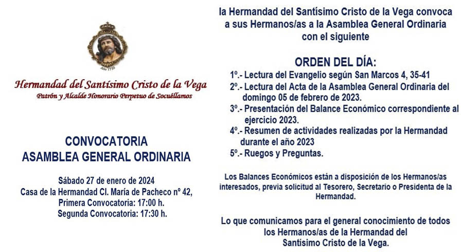 SOCIEDAD Asamblea General Ordinaria de la Hermandad del Stmo. Cristo de la Vega enero 10, 2024 FacebookTwitterWhatsAppEmailTelegram - Publicidad - Tendrá lugar el próximo 27 de enero, los detalles se pueden leer en la imagen adjunta. - Publicidad - TagsAsamblea GeneralHermandad Cristo de la Vega MÁS NOTICIAS Semana que irá del frío al calor El Yugo UD Socuéllamos recibe al CF Fuenalabrada Abierto el plazo para el Curso de Iniciación a la Inteligencia Artificial para emprendedoras en Socuéllamos ASAJA Ciudad Real celebra el endurecimiento de las penas por hurto en el campo y el avance legal frente a la reincidencia La Policía Local de Socuéllamos hace una campaña de control de velocidad hasta el 19 de abril SOCIEDAD Asamblea General Ordinaria de la Hermandad del Stmo. Cristo de la Vega enero 10, 2024 FacebookTwitterWhatsAppEmailTelegram - Publicidad - Tendrá lugar el próximo 27 de enero, los detalles se pueden leer en la imagen adjunta. - Publicidad - TagsAsamblea GeneralHermandad Cristo de la Vega MÁS NOTICIAS El piloto japonés que bombardeó EEUU Farmacias de Guardia en Socuéllamos del 13 al 20 de abril Santoral del 16 de abril. Engracia, Benito, Bernardita, Contardo, Drogone, Fructuoso, Leónidas, Magno, Optato y Toribio. Fallece un trabajador mientras realizaba trabajos en la vía del tren El Museo Torre del Vino acogerá el próximo lunes, 20 de abril, la programación de Onda Cero.