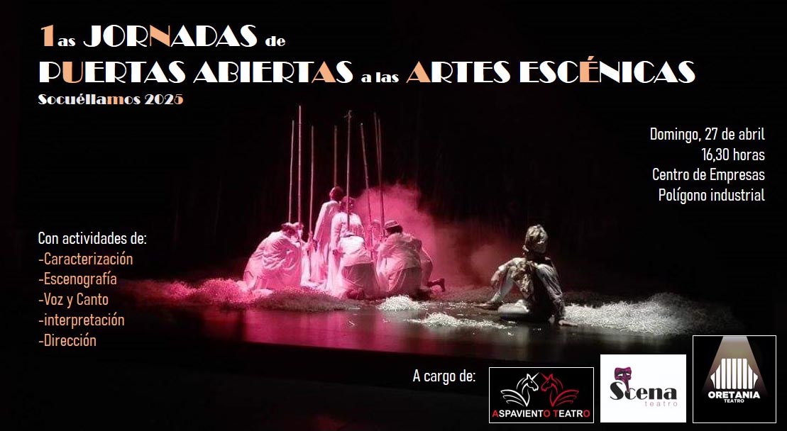 El próximo domingo 27 de abril a las 16:30 h. en el Centro de Empresas, situado en el Polígono El Llano C/ Croacia, 19, se celebrarán las Primeras Jornadas de Puertas Abiertas a las Artes Escénicas organizadas por: Aspaviento Teatro, Scena Teatro y Oretania Teatro.