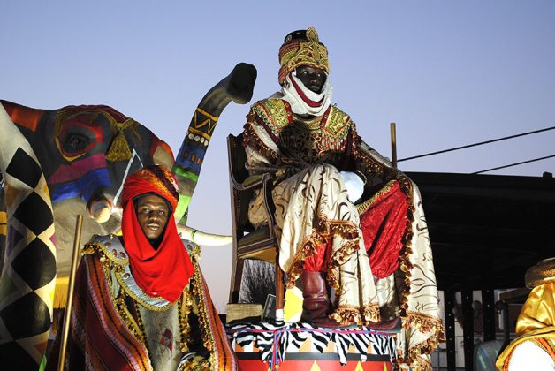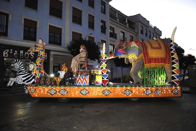 Los Reyes fueron en carrozas alquiladas de gran belleza. Melchor iba entre torres y símbolos egipcios; Gaspar iba en un colorido barco; y Baltasar iba rodeado de animales como cebras, una jirafa y un elefante.