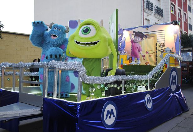 Los siguientes personajes en saludar a los niños fueron Sully y Wazowski, los protagonistas de la película “Monstruos S.A.”, esta carroza la confeccionó el Ampa de El Coso.