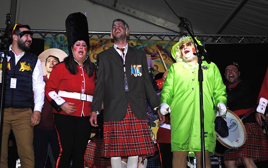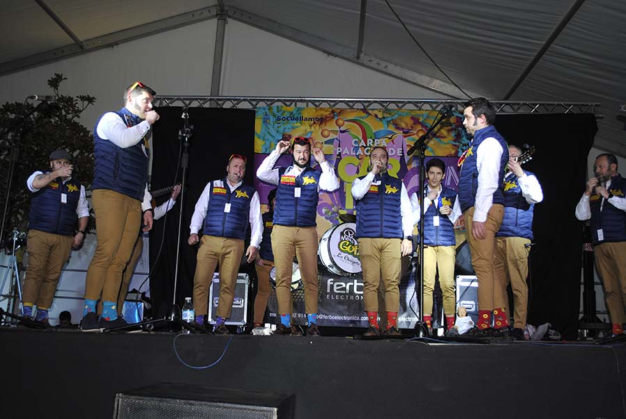 En la noche del domingo 19 de febrero dos agrupaciones divirtieron a los asistentes al Festival de Chirigotas celebrado en la Carpa de Carnaval. La chirigota de Alcázar de San Juan "Pa mear y no echar gota" y los socuellaminos "Tenemos un problema" desplegaron un amplio repertorio de cuplés y pasodobles con ingeniosas letras.
