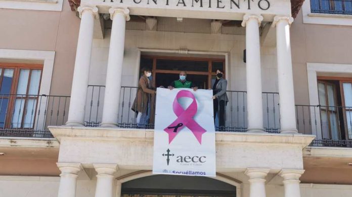 Posteriormente, pasadas las 12 del mediodía, el presidente de la Junta Local, Ignacio Megías, junto a la alcaldesa de Socuéllamos, Elena García, y la edil de bienestar social, Vanessa Sáez, han desplegado un lazo rosa en el balcón del Ayuntamiento. Este año este lazo luce con un crespón negro en señal de duelo por los fallecidos por cáncer y por Covid-19.