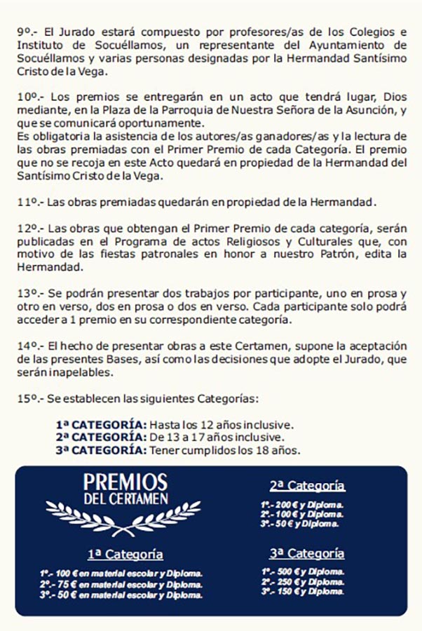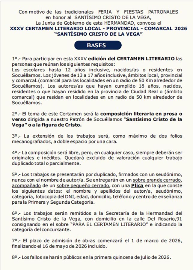 La Hermandad del Santísimo Cristo de la Vega ha convocado la XXXV edición del Certamen Literario Local-Provincial-Comarcal “Santísimo Cristo de la Vega”, correspondiente al año 2026, una cita ya consolidada dentro del panorama cultural de Socuéllamos y su comarca.