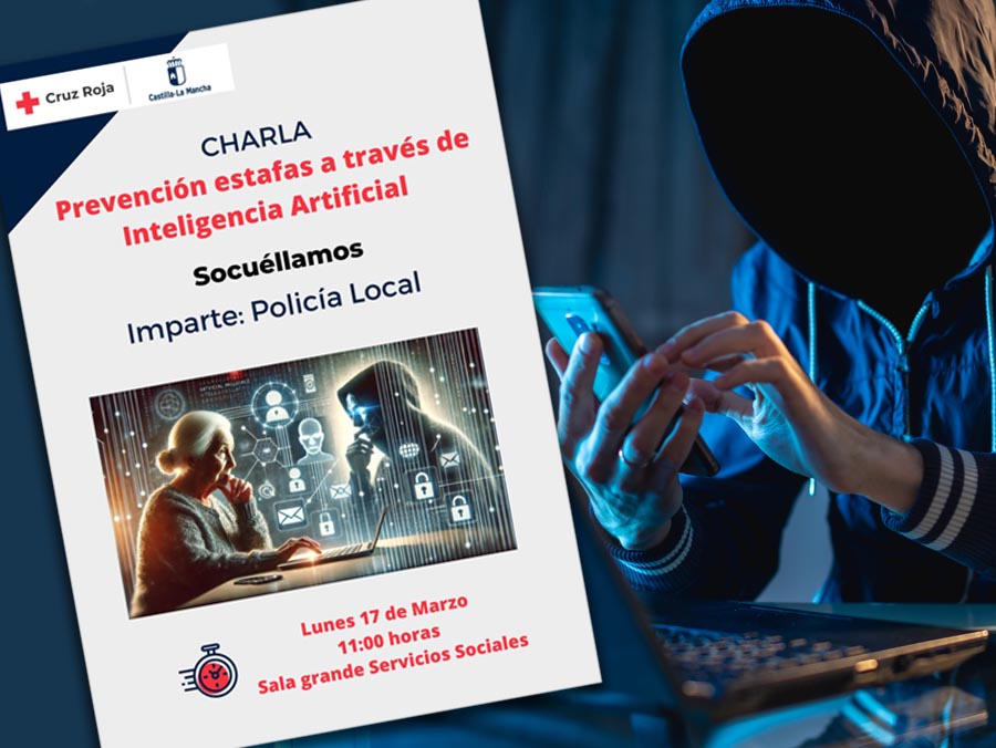 El próximo lunes 17 de marzo a las 11:00 h. en la Sala grande de Servicios Sociales, Cruz Roja organiza una charla con el título de 'PREVENCIÓN DE ESTAFAS A TRAVÉS DE INTELIGENCIA ARTIFICIAL'. La charla será impartida por miembros de la Policía Local de Socuéllamos.