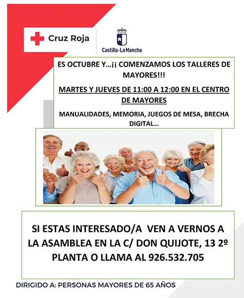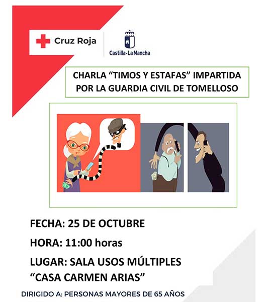 Por otro lado, el 25 de octubre, la asamblea local de Cruz Roja ofrecerá una charla sobre “Timos y estafas” impartida por la Guardia Civil de Tomelloso dirigida a mayores de 65 años.