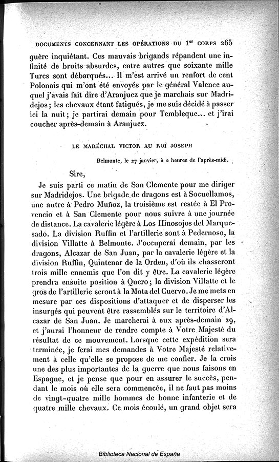 He salido esta mañana de San Clemente para dirigirme a Madridejos. Una brigada de dragones está en Socuéllamos, otra en Pedro Muñoz, la tercera ha quedado en El Provencio y en San Clemente para seguirnos a una jornada de distancia. La caballería ligera en Los Hinojosos del Marquesado. La división Ruffin y la artillería están en Pedernoso, la división Villatte en Belmonte. Se ocupará mañana, por los dragones, Alcázar de San Juan, por la caballería ligera y la división Ruffin, Quintanar de la Orden, donde cazarán a tres mil enemigos que dicen haber(?). La caballería ligera tomará entonces posición en Quero; la división Villatte y el grueso de la artillería estarán en Mota del Cuervo. Por estas disposiciones, puedo atacar y dispersar a los insurgentes que se pueden reunir en el territorio de Alcázar de San Juan. Iré a por ellos pasado mañana, 29 y tendré el honor de informar a Su Majestad del resultado de este movimiento. Cuando termine esta expedición, haré mis pedidos a Su Majestad en relación con lo que propone confiarme. Creo que es una de las cosas más importantes de la guerra que estamos haciendo en España, y creo que para asegurar su éxito, durante el mes en que comenzará, no menos de veinticuatro mil hombres de buena infantería y cuatro mil caballos...