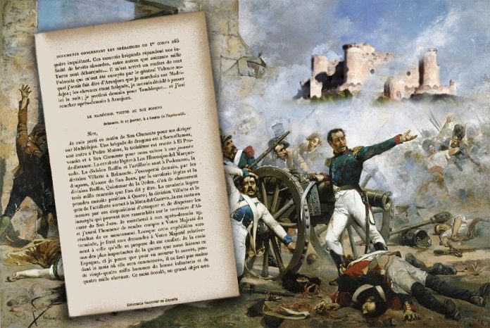 He salido esta mañana de San Clemente para dirigirme a Madridejos. Una brigada de dragones está en Socuéllamos, otra en Pedro Muñoz, la tercera ha quedado en El Provencio y en San Clemente para seguirnos a una jornada de distancia. La caballería ligera en Los Hinojosos del Marquesado. La división Ruffin y la artillería están en Pedernoso, la división Villatte en Belmonte. Se ocupará mañana, por los dragones, Alcázar de San Juan, por la caballería ligera y la división Ruffin, Quintanar de la Orden, donde cazarán a tres mil enemigos que dicen haber(?). La caballería ligera tomará entonces posición en Quero; la división Villatte y el grueso de la artillería estarán en Mota del Cuervo. Por estas disposiciones, puedo atacar y dispersar a los insurgentes que se pueden reunir en el territorio de Alcázar de San Juan. Iré a por ellos pasado mañana, 29 y tendré el honor de informar a Su Majestad del resultado de este movimiento. Cuando termine esta expedición, haré mis pedidos a Su Majestad en relación con lo que propone confiarme. Creo que es una de las cosas más importantes de la guerra que estamos haciendo en España, y creo que para asegurar su éxito, durante el mes en que comenzará, no menos de veinticuatro mil hombres de buena infantería y cuatro mil caballos...