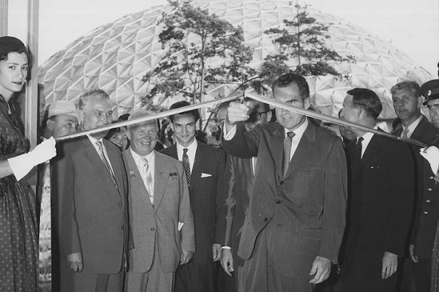 Nikita Krushchev visitó la exposición y fue recibido por el vicepresidente estadounidense Richard Nixon. La noche anterior, uno de los ejecutivos de Pepsi, Donald M. Kendall, visitó a Nixon en la Embajada de los Estados Unidos en Moscú. En contra de las objeciones de su compañía, Kendall, quien tenía planes ambiciosos para expandir los mercados de Pepsi en el extranjero, le rogó a su amigo Nixon que lo ayudara a poner una Pepsi en las manos de Krushchev. Las Pepsi del stand, estaban hechas unas con agua rusa y otra con agua estadounidense.