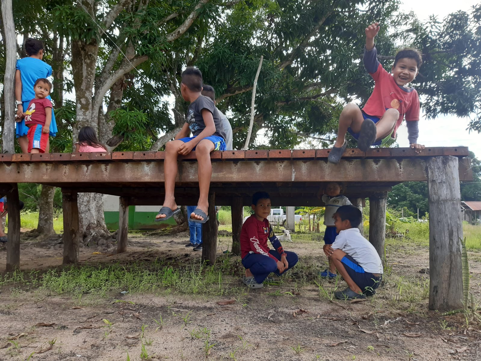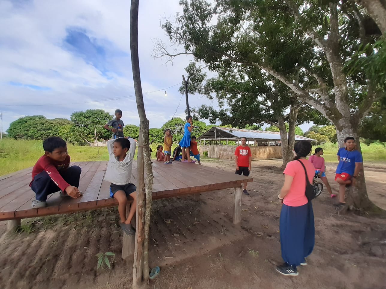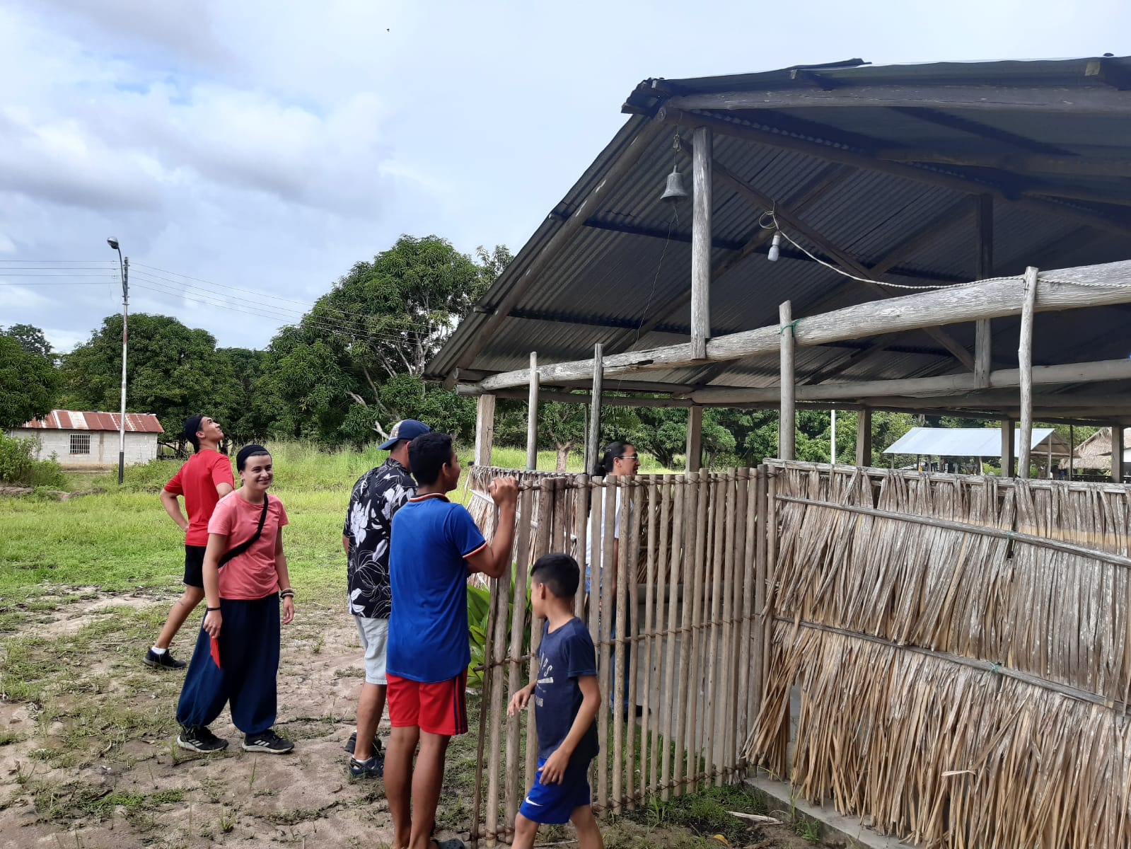 Tras la comida y un poquito de descanso, nos hemos ido a conocer la comunidad de Las Piñas, de indígenas curripacos -o kurripakos, según gustos lingüísticos-. Allí es donde vamos a desarrollar nuestra misión la semana que viene. Es menos numerosa que Ekunay, pero los niños que nos han recibido eran encantadores. Nos han enseñado la escuelita y su lugar de culto -los evangélicos ganan por goleada- y nosotros les hemos explicado lo que vamos a hacer cada tarde. Al regreso, hemos parado en la comunidad de Las Lajitas. A ellos, que son aún menos que en Las Piñas, también les hemos invitado a que se unan la semana que viene a las actividades de la tarde. Esta comunidad está a la entrada del desvío para Ekunay y como hoy hemos entrado desde el sentido contrario, nos hemos dado cuenta de que había un cartel de bienvenida a Ekunay. No podíamos dejar pasar la oportunidad de inmortalizar nuestro paso por allá.