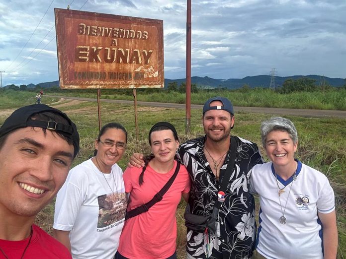 Tras la comida y un poquito de descanso, nos hemos ido a conocer la comunidad de Las Piñas, de indígenas curripacos -o kurripakos, según gustos lingüísticos-. Allí es donde vamos a desarrollar nuestra misión la semana que viene. Es menos numerosa que Ekunay, pero los niños que nos han recibido eran encantadores. Nos han enseñado la escuelita y su lugar de culto -los evangélicos ganan por goleada- y nosotros les hemos explicado lo que vamos a hacer cada tarde. Al regreso, hemos parado en la comunidad de Las Lajitas. A ellos, que son aún menos que en Las Piñas, también les hemos invitado a que se unan la semana que viene a las actividades de la tarde. Esta comunidad está a la entrada del desvío para Ekunay y como hoy hemos entrado desde el sentido contrario, nos hemos dado cuenta de que había un cartel de bienvenida a Ekunay. No podíamos dejar pasar la oportunidad de inmortalizar nuestro paso por allá.