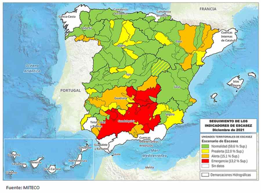 De acuerdo con los datos del Ministerio para la Transición Ecológica y Reto Demográfico, a final de diciembre la situación de los indicadores de Escasez Coyuntural en las demarcaciones hidrográficas intercomunitarias se identifica que los problemas respecto de la escasez coyuntural siguen centrándose principalmente en las demarcaciones del Guadiana, en su cuenca alta, y del Guadalquivir.