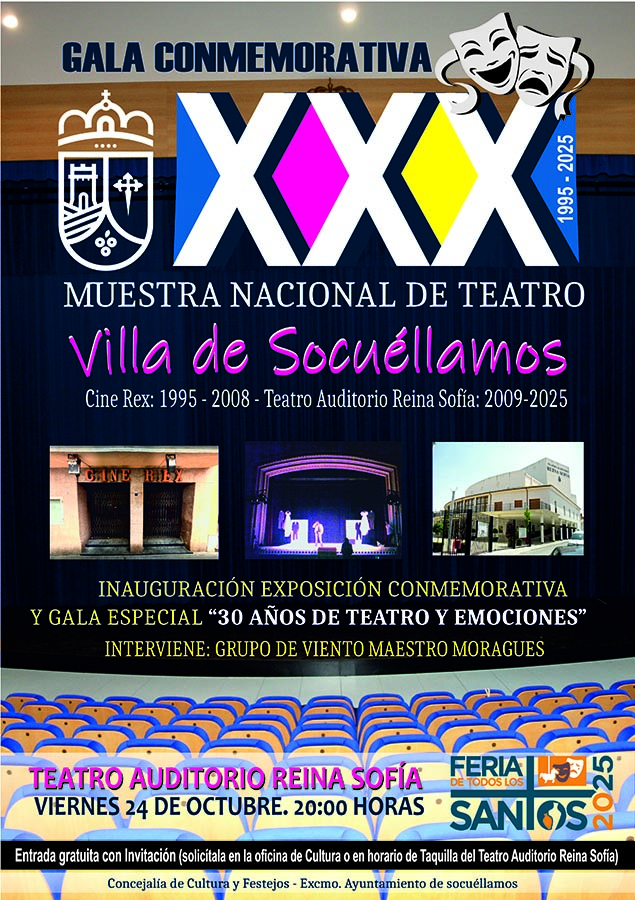 Desde la Concejalía de Educación, Cultura y Festejos del Ayuntamiento de Socuéllamos se informa de la celebración de la Gala Conmemorativa de la XXX Muestra Nacional de Teatro “Villa de Socuéllamos”, que tendrá lugar el viernes 24 de octubre a las 20:00 horas en el Teatro Auditorio Reina Sofía.