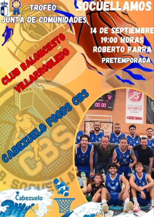El sábado 14 de septiembre a las 19:00 h. en el Pabellón Roberto Parra el CB CABEZUELO SOCUÉLLAMOS recibe al VENTERO CB VILLARROBLEDO en la siguiente ronda del Trofeo Junta de Comunidades de Castilla-La Mancha.