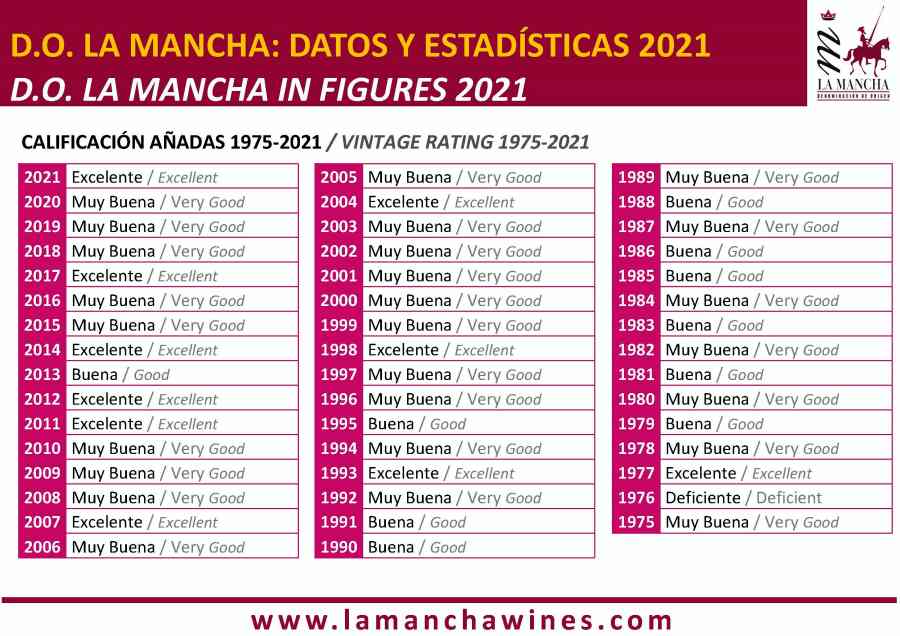 Desde el punto de vista cualitativo la cosecha 2021 ha sido muy positiva para los vinos con Denominación de Origen La Mancha, ya que esta añada ha sido calificada como EXCELENTE según las conclusiones extraídas en la valoración técnica de los vinos catados para obtener esta valoración: 49 muestras a granel escogidas entre las 4 bodegas de mayor volumen de producción con DO en la provincia de Ciudad Real y otras dos de cada una del resto de provincias: Albacete, Cuenca y Toledo.