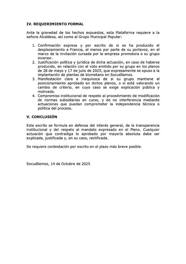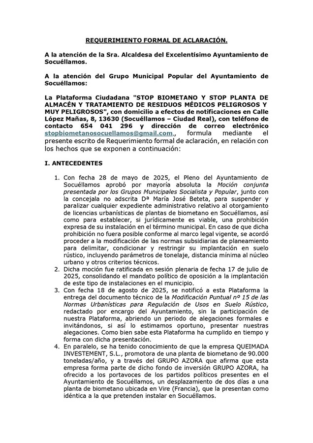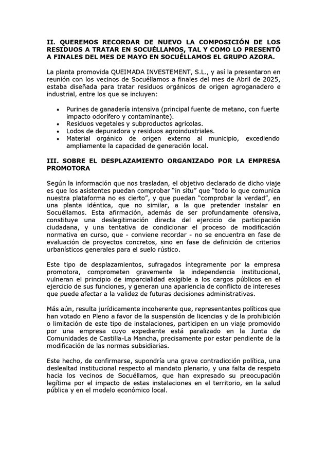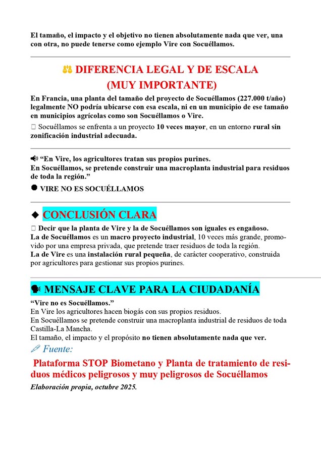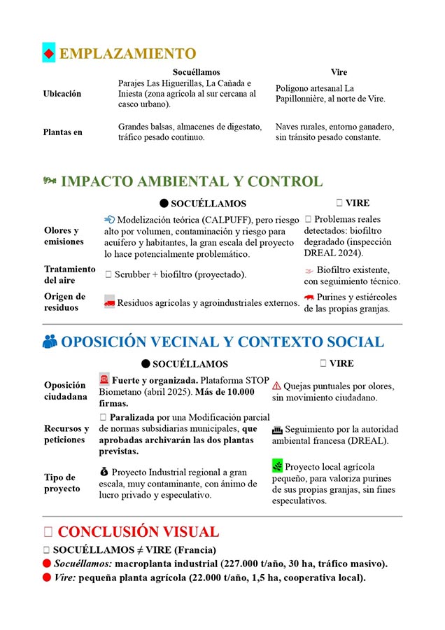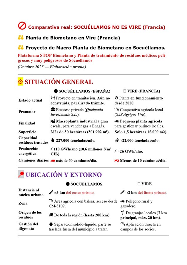 La Plataforma Stop Biometano ha dirigido un escrito a la Alcaldía de Socuéllamos solicitando información y transparencia sobre este viaje, y ha adjuntado un cuadro comparativo entre las dos plantas, en el que defiende que son dos plantas diferentes.
