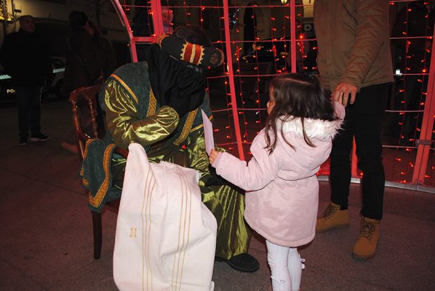 El Heraldo -este año del Rey Baltasar- se sentó en un trono colocado en la bola de luces situada en la Plaza de la Constitución, y los niños fueron entrando en ella para depositar su misiva en el saco que sería entregado después a Melchor, Gaspar y Baltasar.