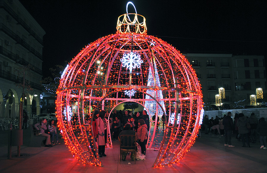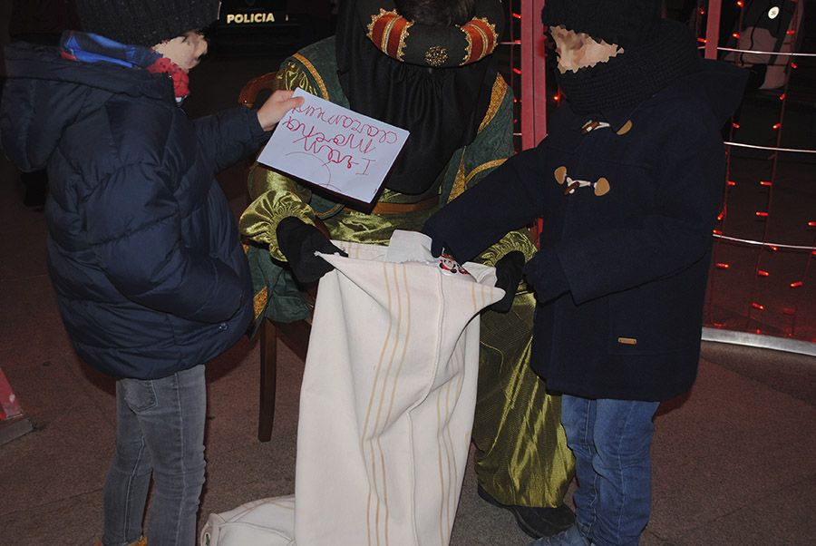 El Heraldo -este año del Rey Baltasar- se sentó en un trono colocado en la bola de luces situada en la Plaza de la Constitución, y los niños fueron entrando en ella para depositar su misiva en el saco que sería entregado después a Melchor, Gaspar y Baltasar.
