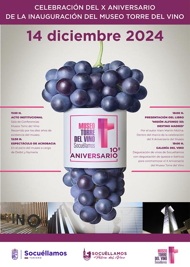 Mañana, martes, 10 de diciembre, el Museo Torre del Vino de Socuéllamos celebra el X Aniversario de su inauguración. Por esta razón, desde la concejalía de turismo del Ayuntamiento se han organizado una serie de actividades que se celebrarán el próximo sábado, día 14.