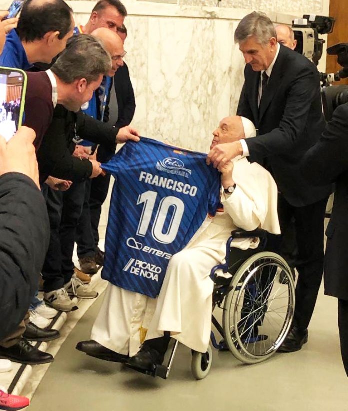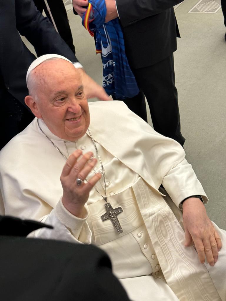 Como estaba previsto la expedición de la Unión Deportiva Socuéllamos ha sido recibida en Audiencia General en el Aula Pablo VI del Vaticano. Aquí podemos ver la fotografía en la que el Santo Padre recibe la camiseta conmemorativa con su nombre de manos de los representantes de la Junta. El Papa ha agradecido este regalo.