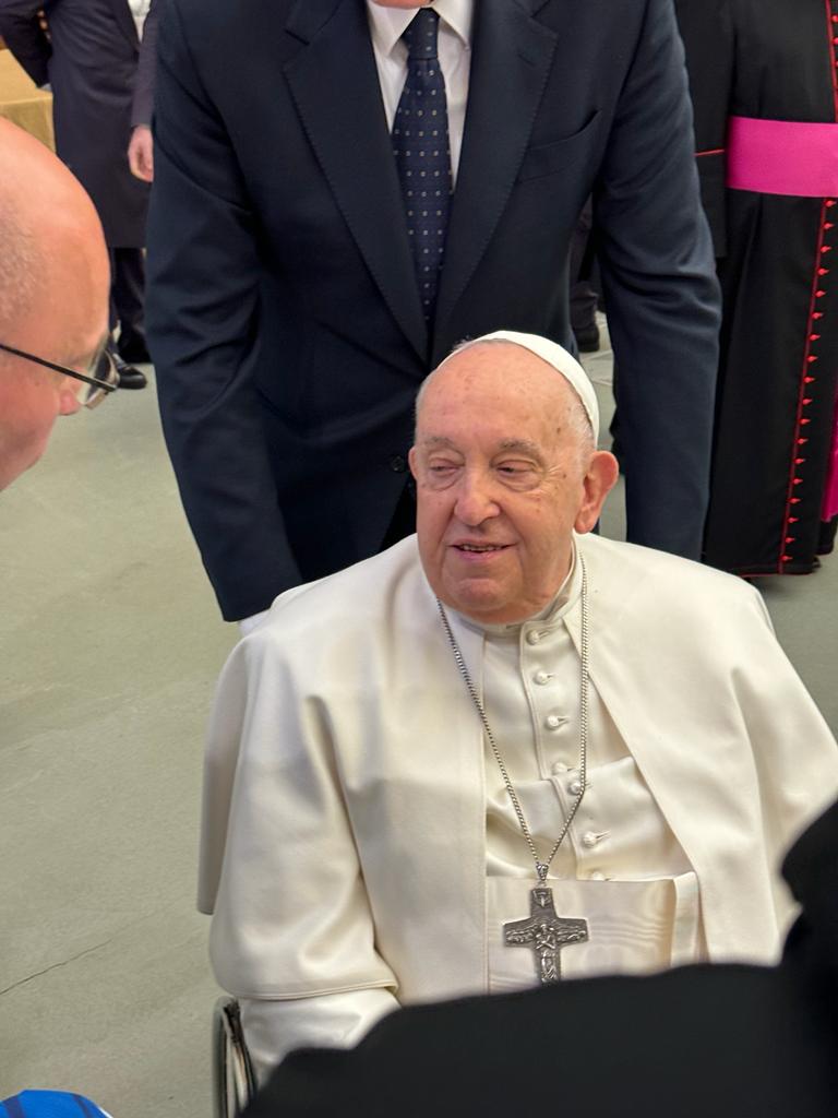 El Papa se desplazaba en una silla de ruedas debido a su delicado estado de salud que no ha sido excusa para atender a todo el público que le esperaba para conocerlo en persona.