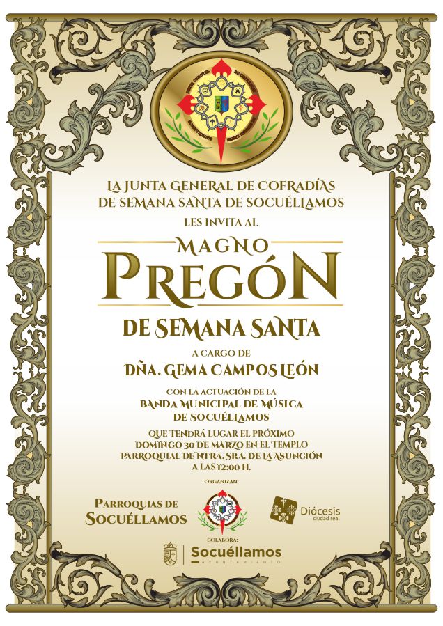 La Junta General de Cofradías de Semana Santa de Socuéllamos celebrará el MAGNO PREGÓN DE SEMANA SANTA en el Templo Parroquial de Ntra. Sra. de la Asunción a las 12:00 h. y será a cargo de Gema Campos León. El evento contará con la actuación de la Banda Municipal de Socuéllamos dirigida por Inmaculada Alcolea Padilla.