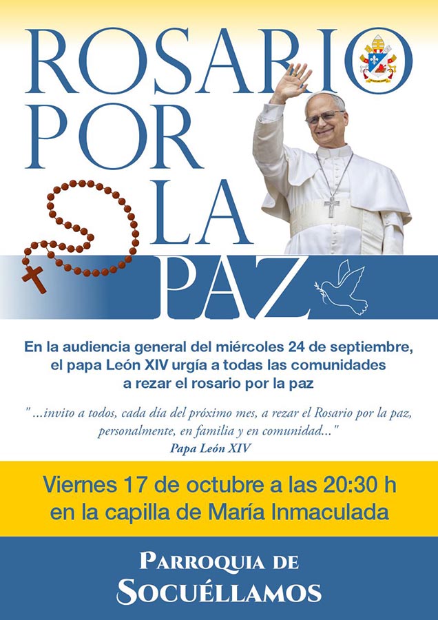 En la noche del viernes, la Capilla de la Inmaculada acogió un emotivo Rosario por la Paz, una iniciativa convocada por el Papa León XIV y organizada por la Parroquia de Socuéllamos. El encuentro reunió a numerosos fieles en un ambiente de recogimiento y oración.