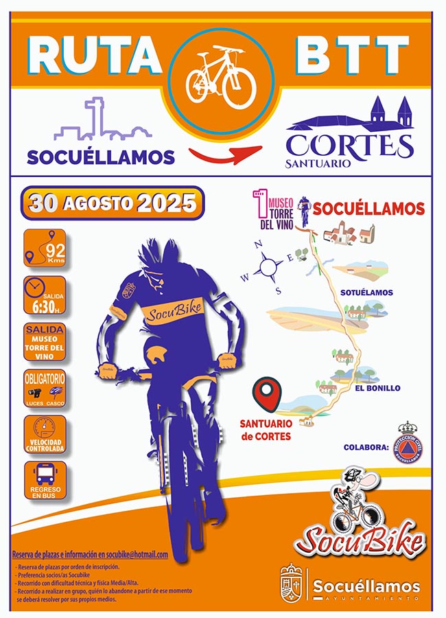 El próximo 30 de agosto de 2025, los amantes del ciclismo de montaña tienen una cita ineludible con la Ruta BTT Socuéllamos – Santuario de Cortes, organizada por SocuBike con la colaboración del Ayuntamiento de Socuéllamos y Protección Civil.