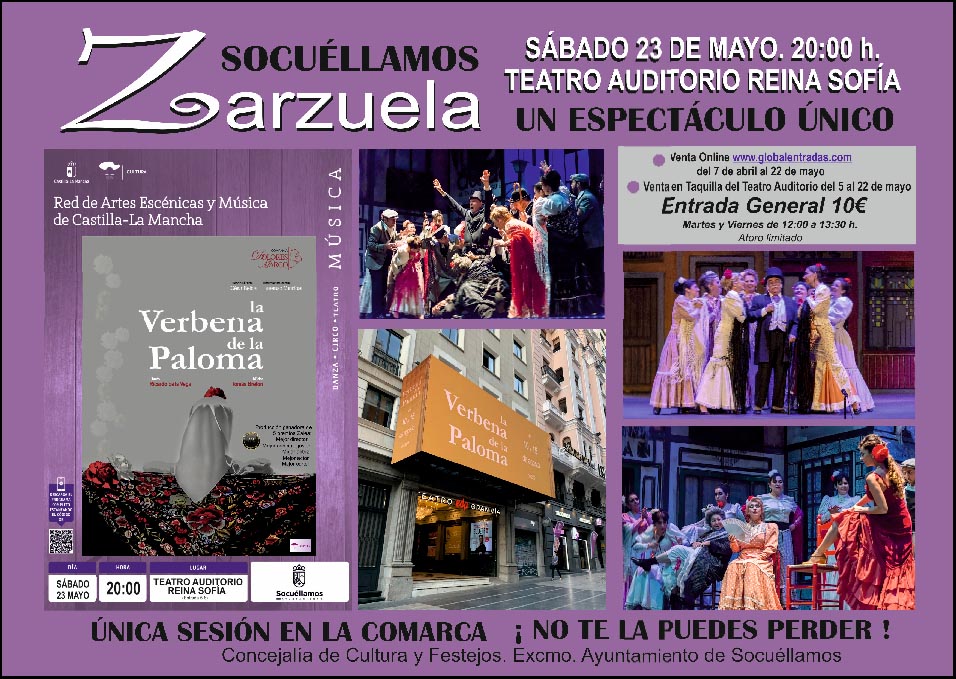 El Ayuntamiento de Socuéllamos, a través de la Concejalía de Cultura y Festejos y la Red de Artes Escénicas y Música de Castilla-La Mancha, traerá a nuestra localidad uno de los grandes hitos de la cultura musical nacional: La Verbena de la Paloma. La esperada representación, que será única sesión en la comarca, tendrá lugar el próximo sábado 23 de mayo a las 20:00 horas en el Teatro Auditorio Reina Sofía. Los asistentes podrán disfrutar de este gran espectáculo por una entrada general de 10 euros.