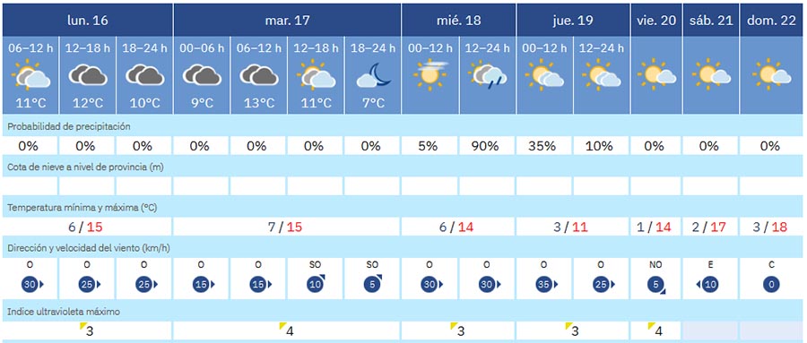 La inestabilidad se acentuará entre el martes 17 y el miércoles 18. Para estas jornadas, la AEMET estima una probabilidad de lluvia que oscila entre el 50% y el 70%. Serán precipitaciones de carácter débil, pero suficientes para requerir el uso del paraguas. Las temperaturas máximas se mantendrán suaves, rondando los 14 o 15 grados, mientras que las mínimas se situarán entre los 5 y 7 grados.