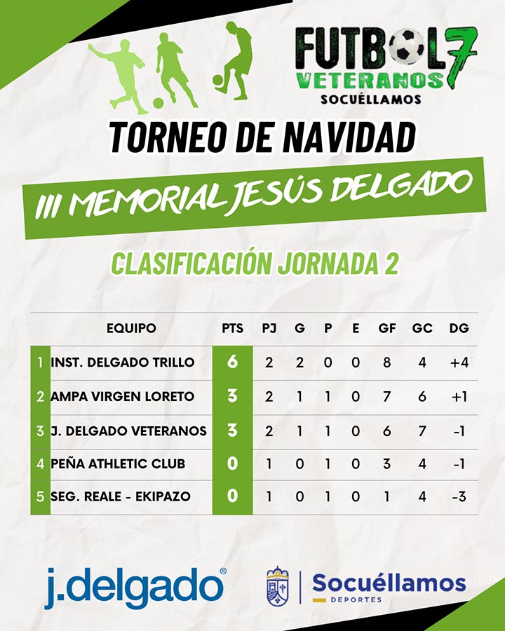 Tras estos resultados, la clasificación general queda encabezada por el Inst. Delgado Trillo, que suma 6 puntos en dos partidos y se mantiene invicto. Le siguen AMPA Virgen Loreto y J. Delgado Veteranos, ambos con 3 puntos, mientras que Peña Athletic Club y Seguros Reale-Ekipazo aún no han estrenado su casillero.