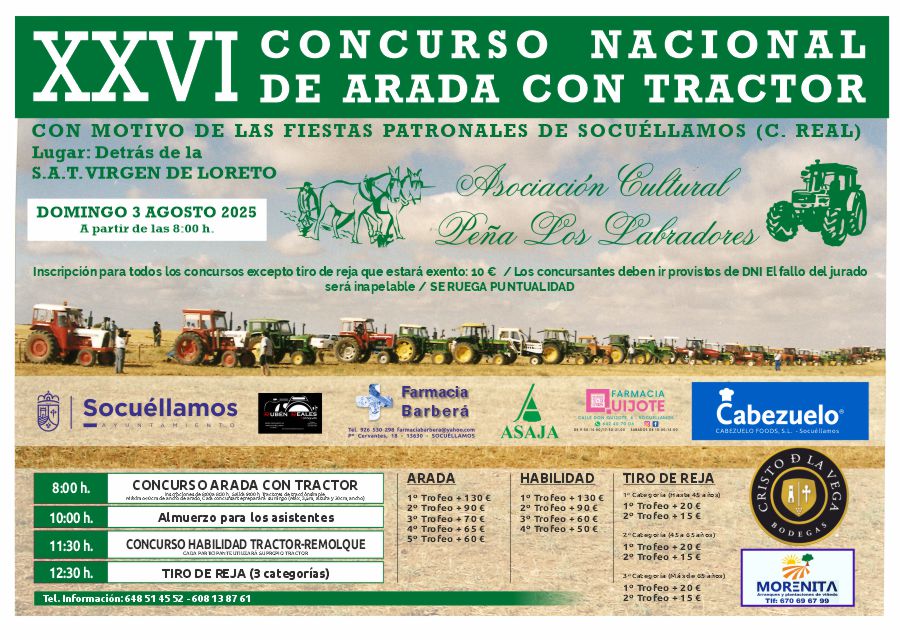 Con motivo de las Fiestas Patronales de Socuéllamos se celebrará la 26ª edición del Concurso Nacional de Arada con Tractor, un concurso organizado por la Asociación Peña Los Labradores y con la colaboración del Ayuntamiento de Socuéllamos además del apoyo de muchas firmas particulares.