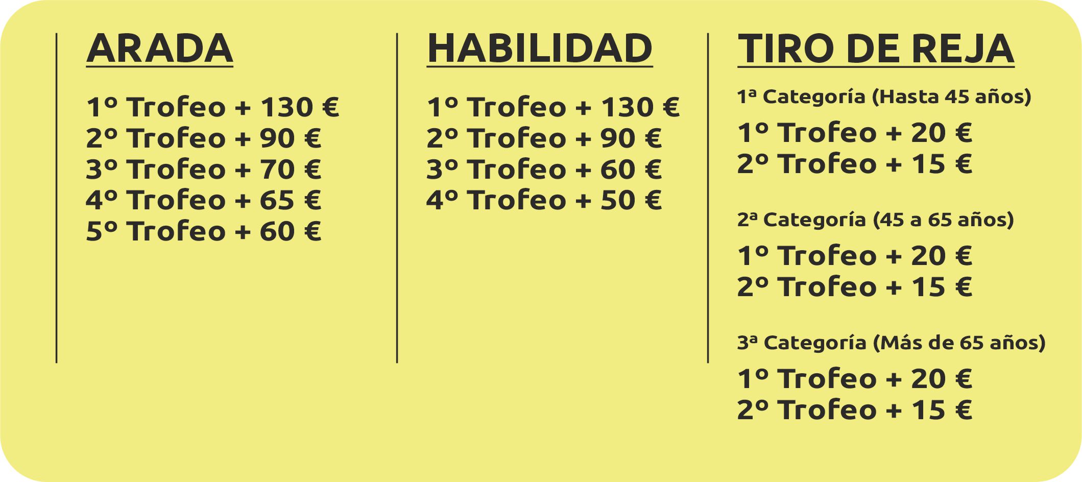 El concurso se subdivide en varias especialidades, en todas ellas la inscripción es de 10 €, excepto en el tiro de reja, que es gratuito. La programación de la mañana será la siguiente: