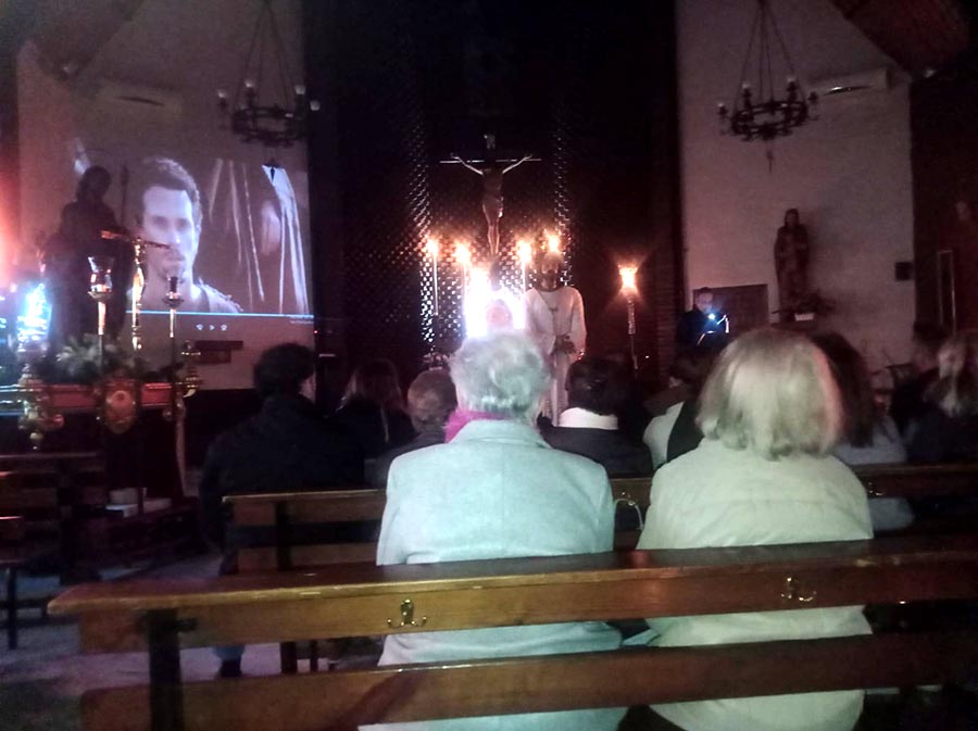 En el caso de esta noche los miembros de la Cofradía acompañaron las distintas estaciones con imágenes de la película de 'La Pasión' de Mel Gibson, creando un ambiente inmersivo que logró una cercanía a los acontecimientos a los que hace referencia la oración.