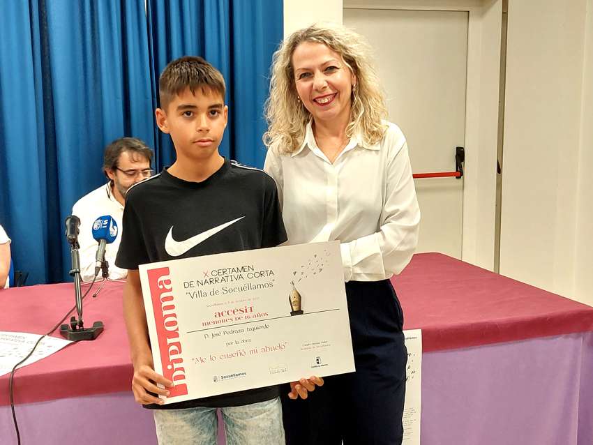 El premio de la categoría dirigida a los menores de 16 años ha sido entregado al socuellamino José Pedraza Izquierdo de 13 años. Ha ganado 150 euros por el texto titulado “Me lo enseñó mi abuelo”. Pedraza cursa estudios de segundo de la ESO en el Colegio Virgen de Loreto, y tiene dos hermanas, su melliza África y Aitana. El relato se lo dedica a sus abuelos, Manolo, Reme, María y Pablo, en quien se ha inspirado para escribirlo.