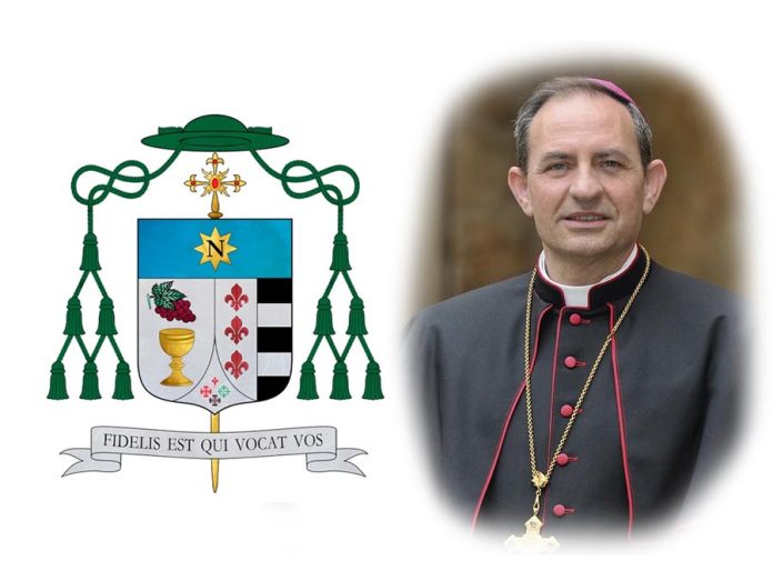 El lema episcopal elegido, “Fidelis est qui vocat vos” (“El que os llamó es fiel”), está tomado de la primera carta que escribió el apóstol San Pablo a la comunidad cristiana de Tesalónica, concretamente del capítulo cinco, versículo 24. En él, el obispo ha querido recoger la certeza de que solo la fidelidad de Dios puede sostener y hacer fructificar el ministerio episcopal. A lo largo de la Escritura, una y otra vez, se remarca que la fidelidad forma parte del ser de Dios, de la manera en que Él es. Dios no rompe su alianza con la humanidad, más bien al contrario: la lleva a plenitud por amor en la alianza nueva y eterna que realiza por medio de su Hijo Jesucristo. Dios nunca abandona a su pueblo, a pesar de la infidelidad de este.