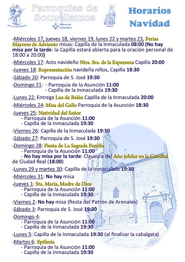 Compartimos los horarios de las celebraciones religiosas de la Parroquia de Socuéllamos durante esta Navidad: