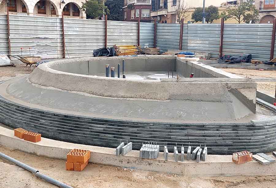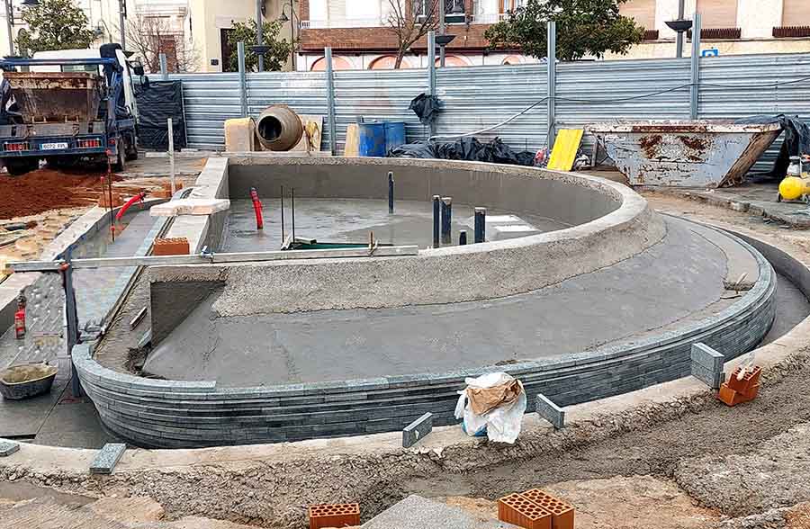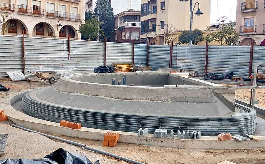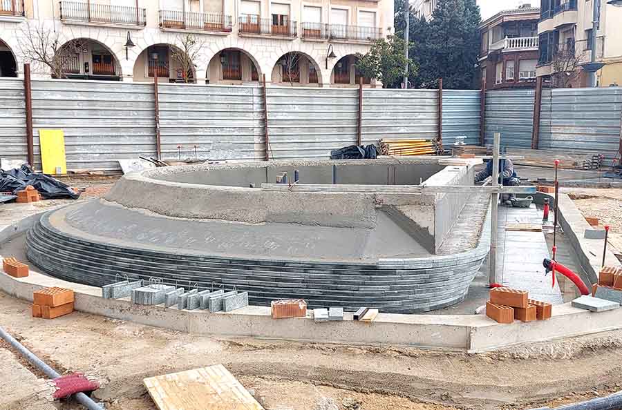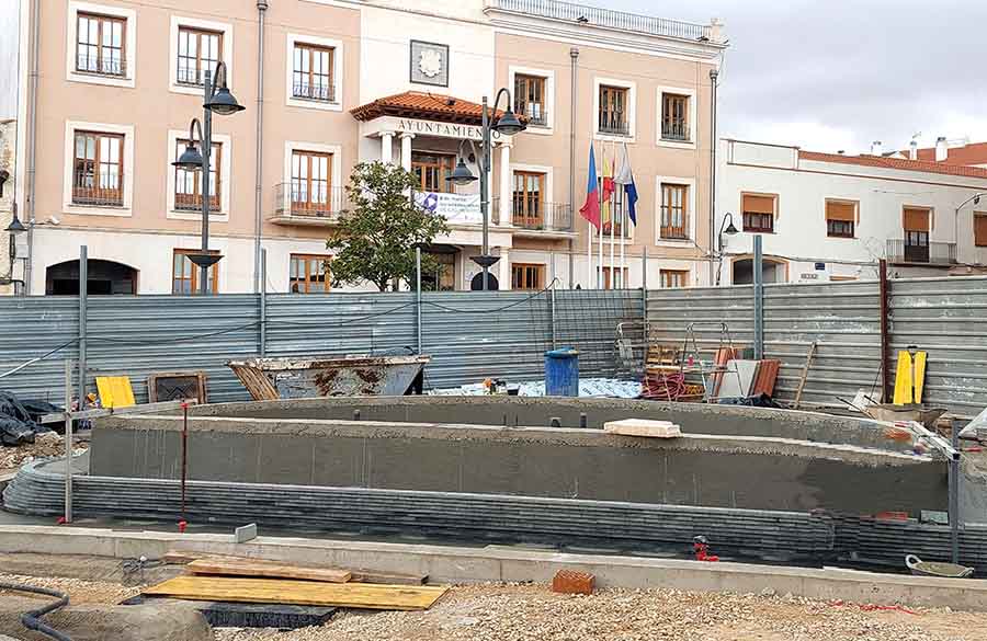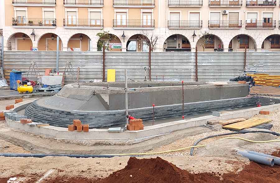 La obra de la nueva fuente y zona ajardinada de la Plaza de la Constitución continúa. Las fotos que les ofrecemos son del 8 de marzo. En ellas se ve la construcción de la fuente y el movimiento de tierra donde se levantará la zona ajardinada. La obra se prevé que esté terminada en el mes de mayo.