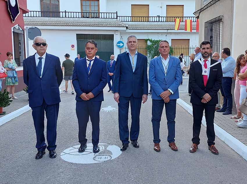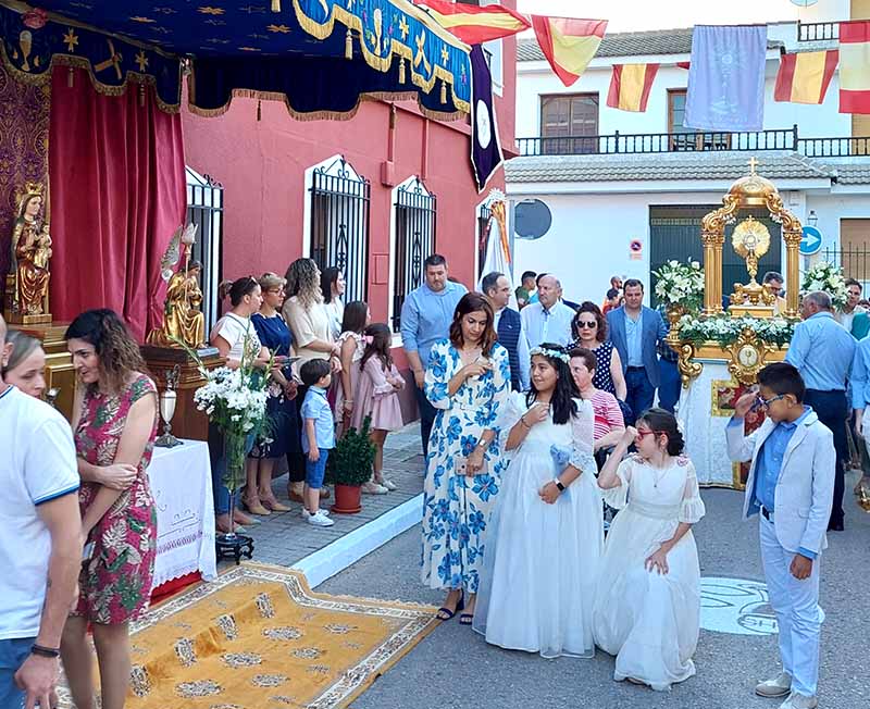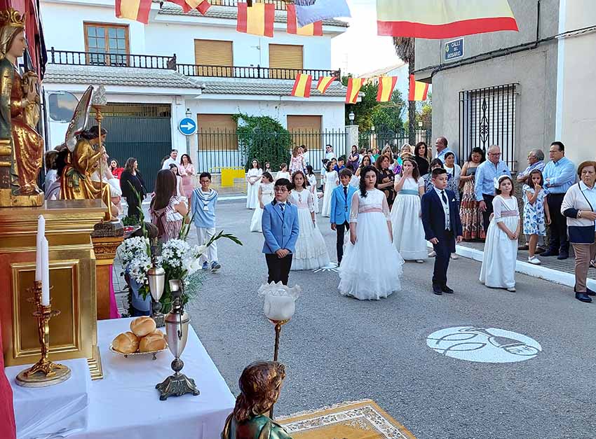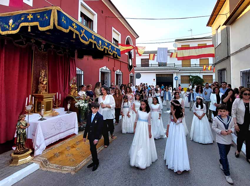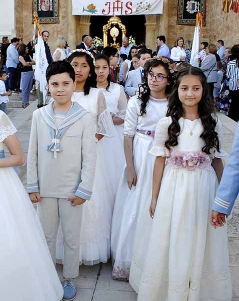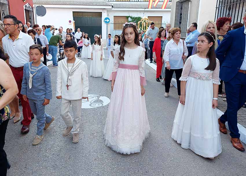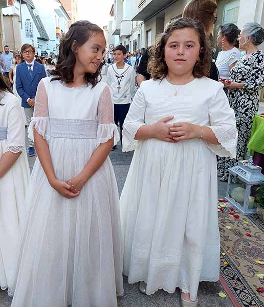 Los estandartes y presidentes de las siete cofradías de Semana Santa, las dos hermandades patronales, y la Hermandad de Oración Madre del Amor Hermoso abrieron el cortejo procesional. Tras ellos, la Banda Municipal de Música dirigida por Inmaculada Alcolea precedía a los 86 niños que este año han tomado su Primera Comunión que discurrían en filas horizontales.
