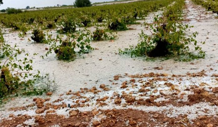 La DANA ha azotado la península este fin de semana causando estragos en diversas zonas del término de Socuéllamos. Los agricultores en plena vendimia están viendo como la lluvia y el granizo han dañado o, directamente, acabado con la cosecha. En zonas como Titos, Molinillos, El Cerro, El Charcón, La Hijosa, el camino de Alcázar, o la zona de la depuradora de agua hay viñedos anegados de agua y dañados por el granizo. Las siguientes fotos y videos han sido facilitados por agricultores y por Aeroalonvik. /