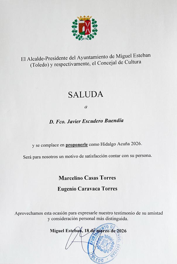- 13:00 h: Acto de Distinción Hidalgo Acuña 2026 a D. Fco. Javier Escudero Buendía.