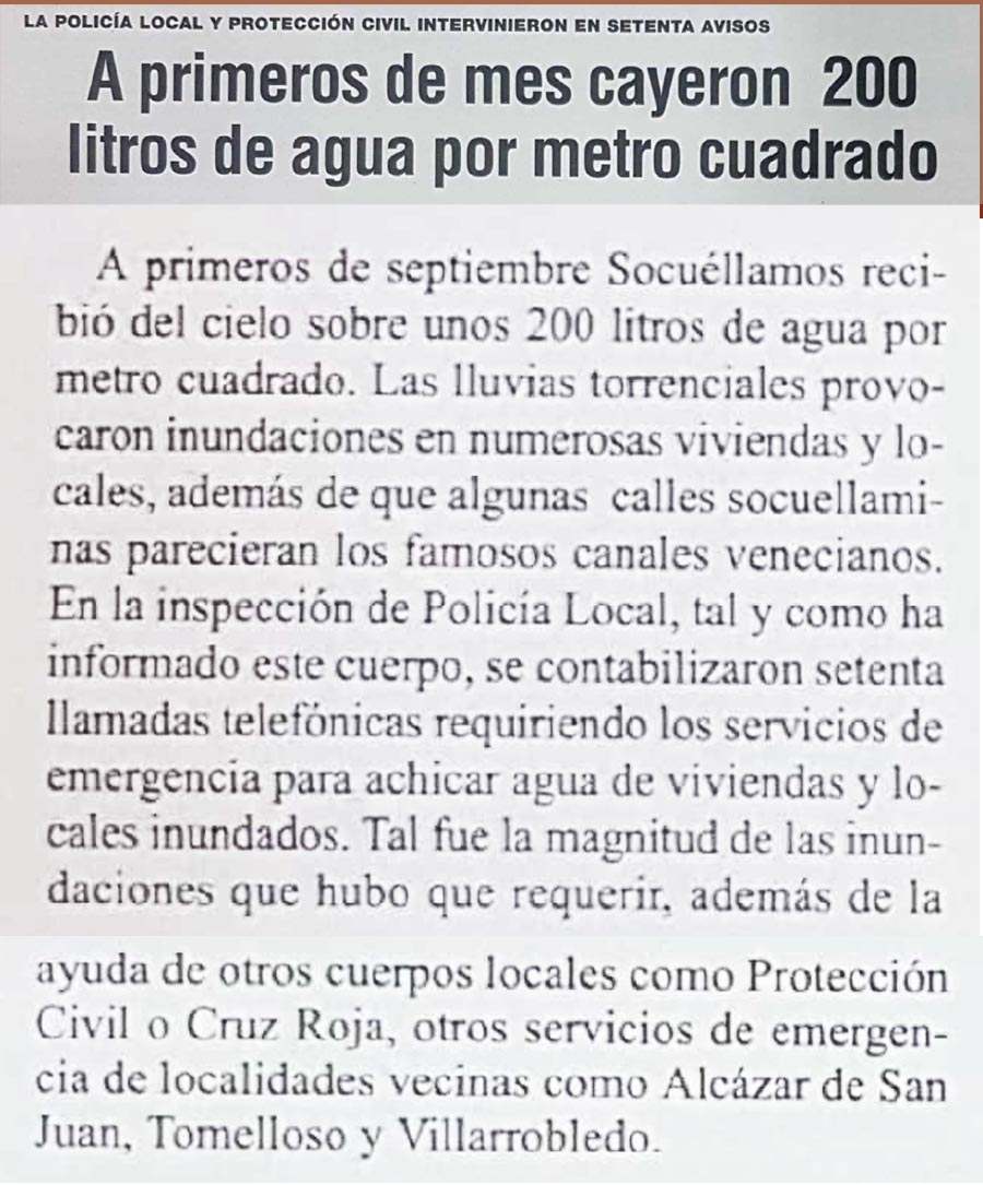 HISTORIAHACE 25 AÑOS HACE 25 AÑOS CAYÓ UNA TROMBA DE AGUA, 200 LITROS POR METRO CUADRADO QUE INUNDARON EL PUEBLO septiembre 24, 2024 FacebookTwitterWhatsAppEmailTelegram - Publicidad - A primeros de septiembre del año 1999 cayó del cielo una gran tromba de agua que provocó inundaciones en algunos lugares del pueblo... - Publicidad - TagsHACE 25 AÑOSINUNDACIONES 1999TROMBA DE AGUA MÁS NOTICIAS El Club E.B. Socuéllamos organiza el Torneo 3x3 de Navidad que se celebrará el viernes 2 de enero Santoral del 29 de diciembre. Tomás El tiempo se mantendrá con pocas variaciones en el final y entrada de año. Miembros de la familia Alcolea procedentes de distintas partes de la geografía española se reúnen con motivo de la Navidad Santoral del 27 de diciembre. Juan y Fabiola HISTORIAHACE 25 AÑOS HACE 25 AÑOS CAYÓ UNA TROMBA DE AGUA, 200 LITROS POR METRO CUADRADO QUE INUNDARON EL PUEBLO septiembre 24, 2024 FacebookTwitterWhatsAppEmailTelegram - Publicidad - A primeros de septiembre del año 1999 cayó del cielo una gran tromba de agua que provocó inundaciones en algunos lugares del pueblo... - Publicidad - TagsHACE 25 AÑOSINUNDACIONES 1999TROMBA DE AGUA MÁS NOTICIAS Gómez Alarcón, en contra de los Planes Especiales de Sequía (PES) por obviar el impacto socioeconómico en los regantes La Concejalía de Seguridad Ciudadana hace entrega de drones a la Policía Local y Protección Civil Un concesionario de Tomelloso vende 100 tractores en 2025 Los Reyes Magos. El incienso y la mirra Farmacias de guardia en Socuéllamos del 29 de diciembre de 2025 al 5 de enero de 2026