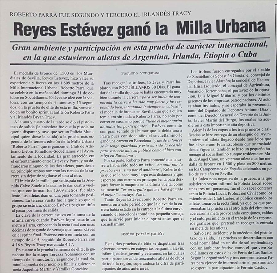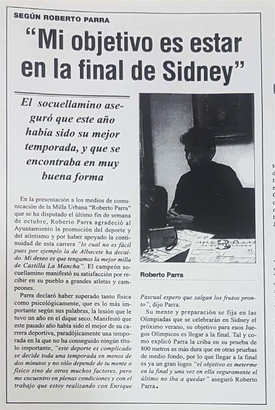 Hace 2 años Roberto Parra estaba en muy buena forma y su proyecto era estar en la final de Sydney. La Milla Urbana era de las más prestigiosas en Castilla-La Mancha. Al final la carrera la ganó por poco Reyes Estévez y Roberto quedó segundo... Pero veamos mejor los documentos de la época...